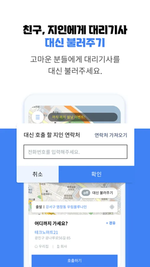 2) 대신불러주기: 친구나 지인의 대리운전 기사를 대신 호출(결제 포함)하는 기능을 제공합니다. 동시에 여러 건을 대신 불러줄 수 있기에 술자리에서 음주운전을 막아주는 멋진 사람이 될 수 있습니다.