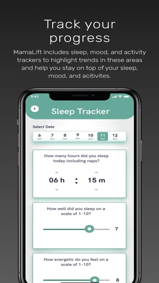 Trackers: MamaLift includes sleep, mood, and activity trackers to highlight trends in these areas and help you stay on top of your sleep, mood, and acitivites.