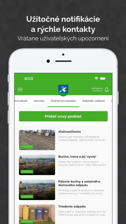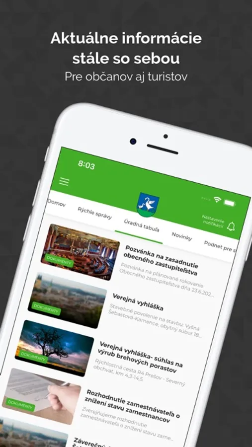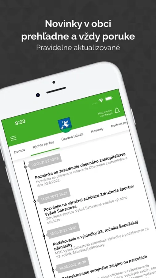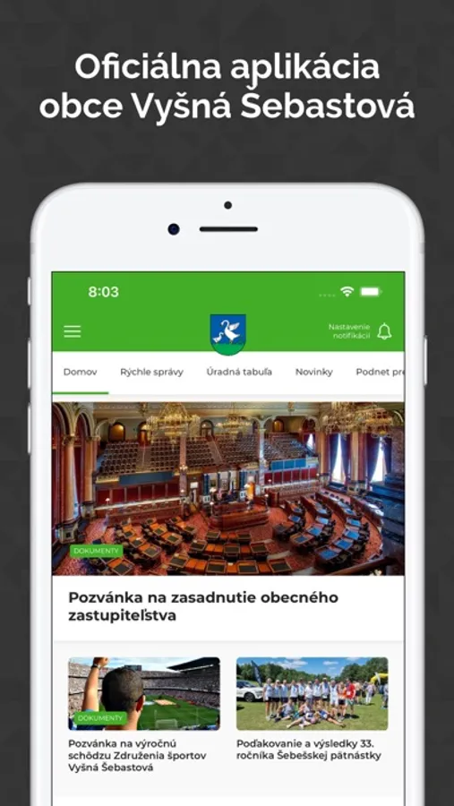Mobilná aplikácia obce Vyšná Šebastová. V aplikácii nájdete aktuálne informácie z diania v obci, kalendár, dôležité kontakty aj top lokality. Môžete si nastaviť upozornenia na rôzne udalosti, od noviniek, cez udalosti kalendára až po denné sumáre. Obec Vám v prípade kritickej situácie (napr. povodne) môže poslať upozornenie priamo do aplikácie.
