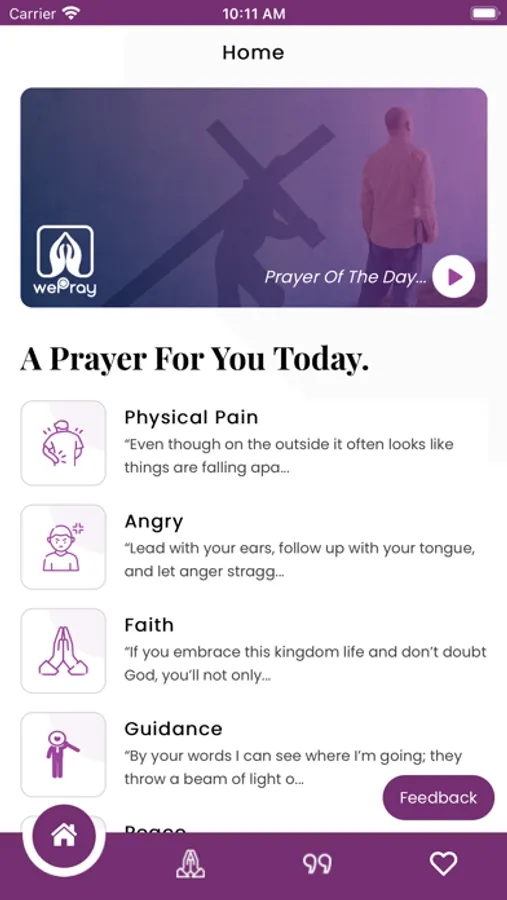 WePray delivers not only heartfelt prayers on daily issues, but also allows you to save favorite quotes and prayers. The purpose of WePray is simple… allow everyone and anyone access to prayers recorded by regular people, who like our users, express a need to engage the Creator for daily encouragement.