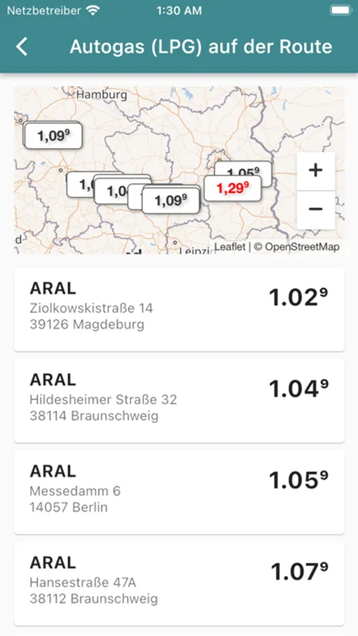 Dann erhälst du eine Übersicht mit den Tankstellen in dem gewählten Ort. Diese sind nach den Spritpreisen sortiert: Günstige Tankstellen sind oben, teure Tankstellen unten. Falls du an einer Tankstelle den Sprit nicht bekommen solltest, da diese beispielsweise geschlossen hat, wird diese unter den Ergebnissen unten am Ende ohne Preisangabe dargestellt.
