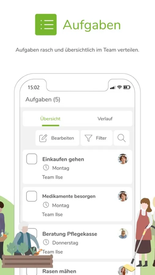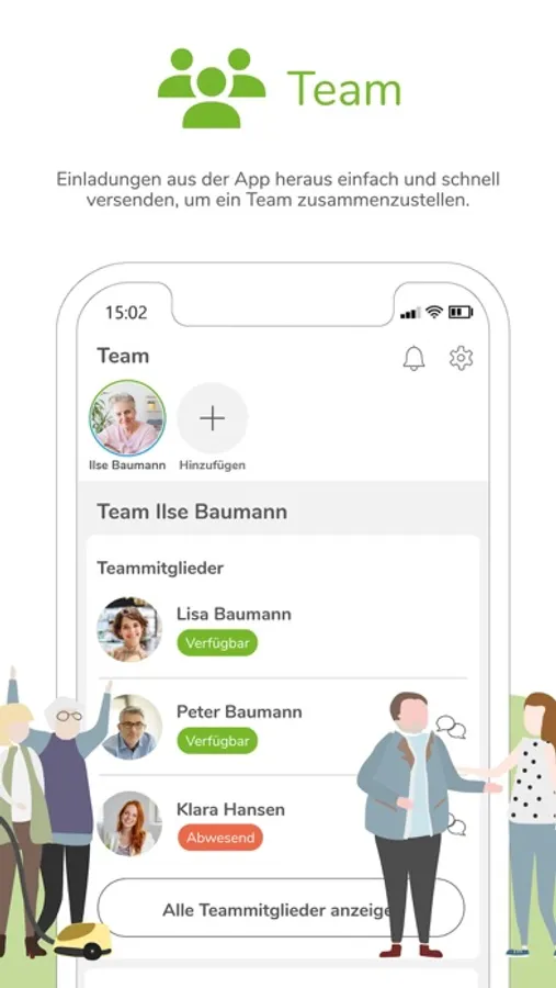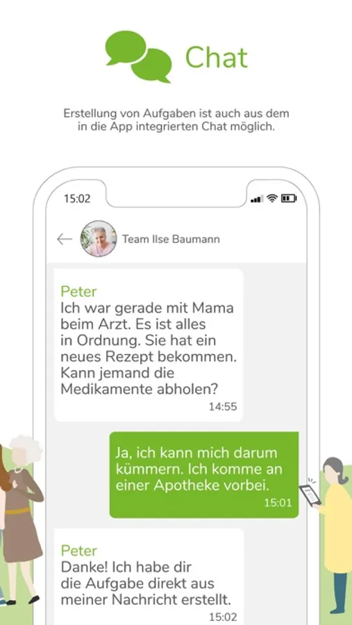 Die Vitakt-App sorgt für Transparenz und Struktur: Ihr steht mit der Bewältigung der Aufgaben nicht allein da, sondern könnt ein Pflegeteam zusammenstellen und die einzelnen Mitglieder und Rollen bestimmen und verwalten. Wer soll mich vor Ort im Team unterstützen, z.B. bei der Betreuung, bei Einkäufen oder der Beschaffung von Medikamenten? Wer wohnt weiter weg und kann dementsprechend besser am Telefon für die zu pflegende Person da sein? Wer möchte immer über ihr Wohlbefinden informiert sein und muss dazu nicht mehr extra angerufen werden? – Mit Hilfe der App seid ihr nicht mehr Alleinkämpfer, sondern habt immer jemanden an eurer Seite.
