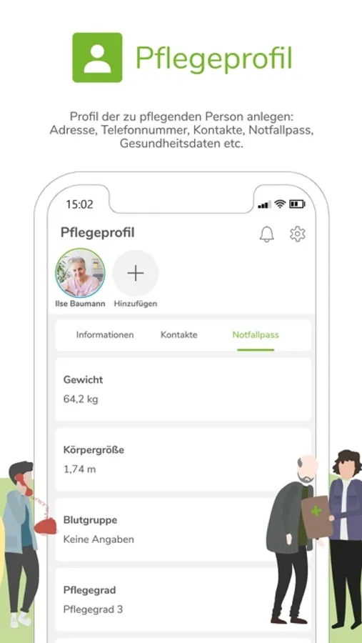 Damit ihr gut über die Person Bescheid wisst, um die ihr euch gemeinsam kümmert, könnt ihr ein Pflegeprofil anlegen. Dieses dient zum Sammeln und Austauschen von Informationen. Neben dem zentralen Adressbuch mit allen Kontakten der zu pflegenden Person findet ihr dort die allgemeinen Daten zu Geburtsdatum, Adresse und Telefonnummer. Außerdem kann im Notfallpass hinterlegt werden, wo ihr wichtige Dokumente wie eine Vorsorgevollmacht oder die Patientenverfügung findet. Alles ganz sicher und unter Berücksichtigung des europäischen Datenschutzstandards gemäß DSGVO.