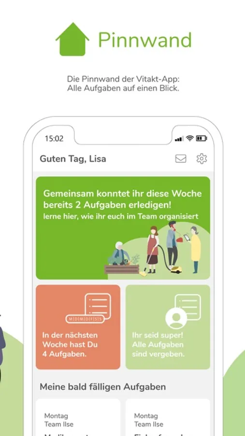 Erlebt das Gefühl von Zusammenhalt und Anerkennung in der Gemeinschaft! Die Vitakt-App verbindet Angehörige, Freunde und Nachbarn und macht aus Einzelnen ein Team. Zusammen organisiert ihr den Alltag und schafft Lösungen für die Personen, um die ihr euch gemeinsam sorgt.