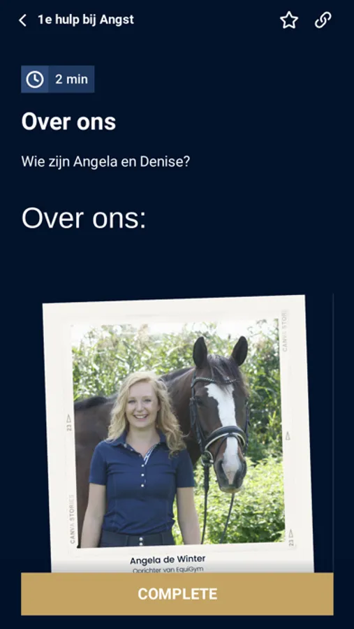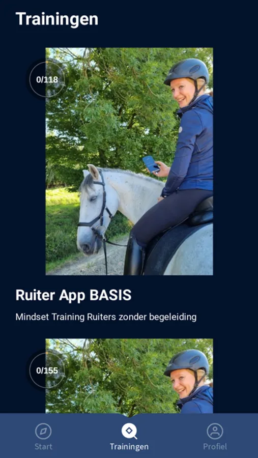 Online mindset trainingen speciaal voor ruiters in een handige app. Een goede rit begint bij de juiste mindset. Verbeter je rit via deze unieke en bewezen formule. Stel, track en haal je doelen, volg de training, doe mee aan challenges en connect met de trainers en gelijkgestemde ruiters in de community. Thuis, op stal of op je paard. Altijd in je broekzak, altijd bij de hand! Trainingen voor iedere ruiter, met specialisaties voor angstige, onzekere, gevoelige én perfectionistische ruiters.