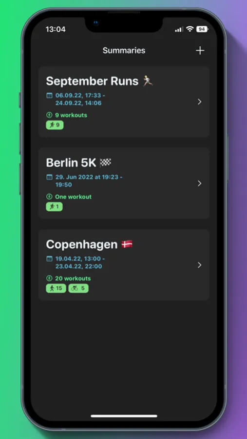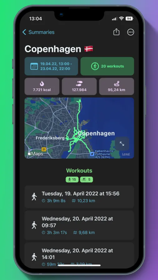 With SUMRY you can pool the health data of multiple workout sessions or specific time ranges into overviews. Like this you're for example able to check how active you've been during the last month or which areas you covered during your last vaccation.