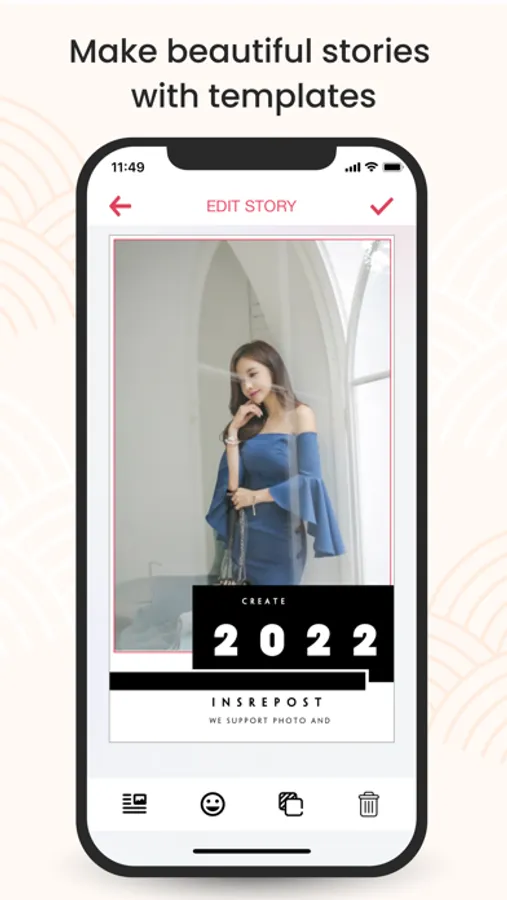 InsRepost lets you stand out in the easiest way. With many unique and chic designs to express your thoughts and life moments into elegant stories. Just select some photos, make them special with templates, text, background, and stickers and it's done. Share your stories and taste on Instagram, Facebook, or Twitter with the world.