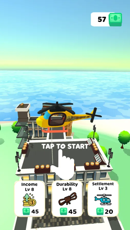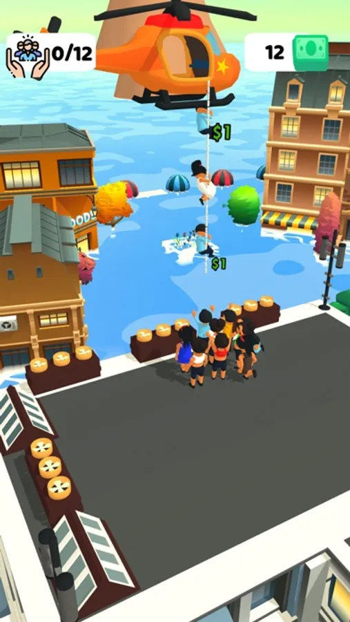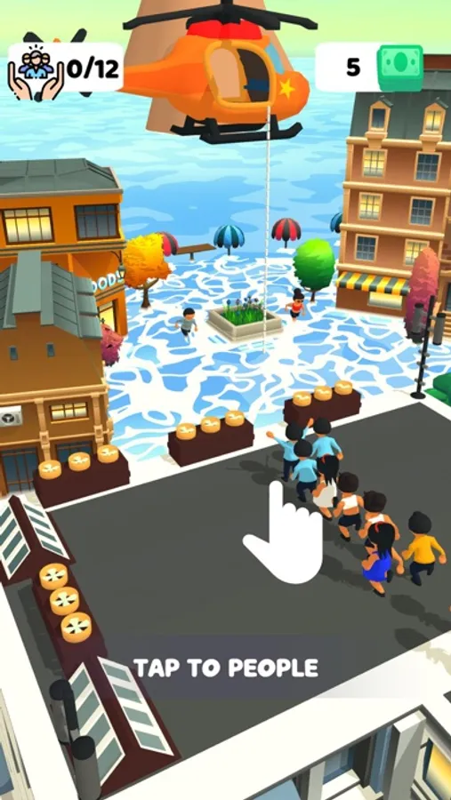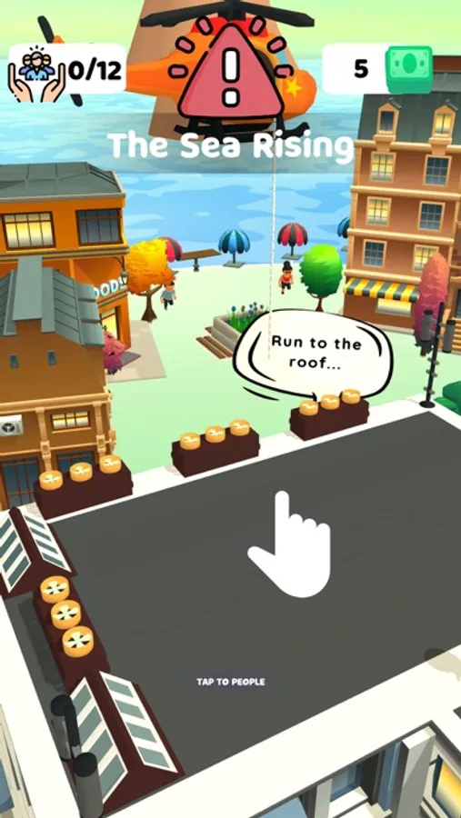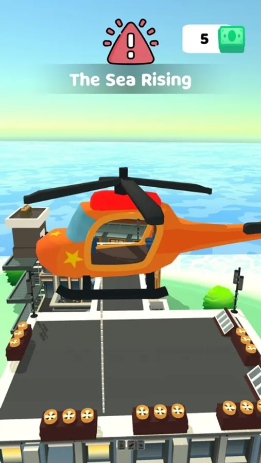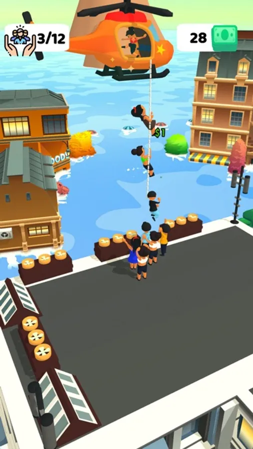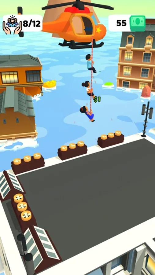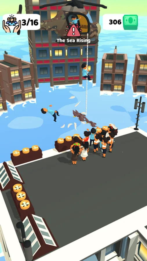 Climb the rope to save people from the sea rise. Save as many people as you can and deliver to the helicopter.Pay attention to sea height