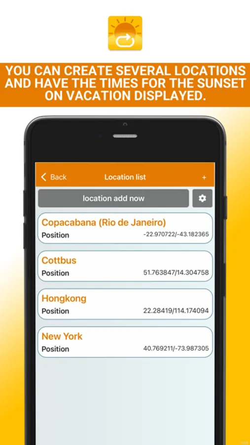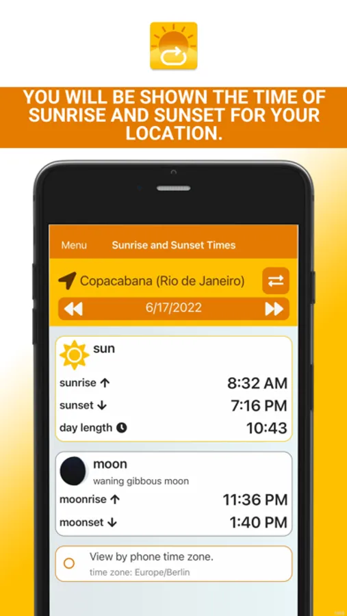 You will be shown the time of sunrise and sunset for your location. You can also display the sunrise and sunset for any location on earth and save them in a clear list.