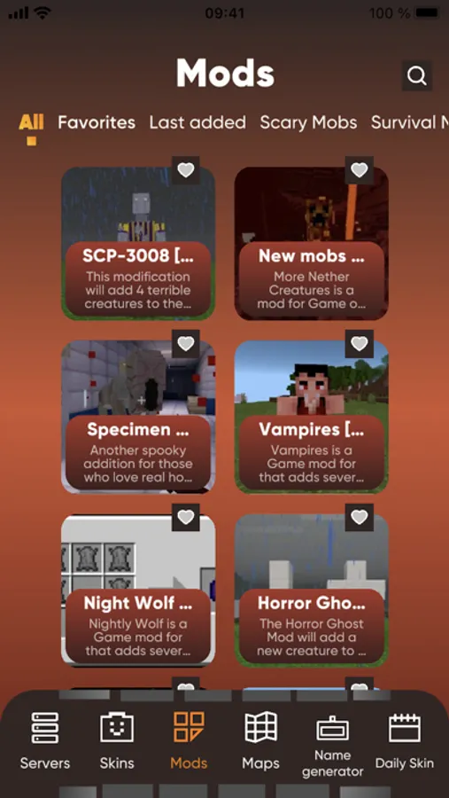 Horror Mobs Mods for Minecraft is an application that allows fans to add mods, maps, skins and addons to your favorite game. With a few clicks, you will discover the characters and places of the famous game. If you like to titillate your brain, this application is for you. Mods and maps will turn your game into a real horror, so this add-on is not for the faint of heart. We are sure that all the horror add-ons presented in our application will pleasantly surprise you.Application with a huge catalog of skins, maps and extras that will add variety, contrast and brightness to your game. Choosing one thing will be very difficult, because among the many categories want everything at once. In addition to a large selection of supplements, you have the option to generate your own nickname and a daily drawing of skins. The application has a simple and intuitive interface that allows you to quickly and easily add additions to the virtual world.