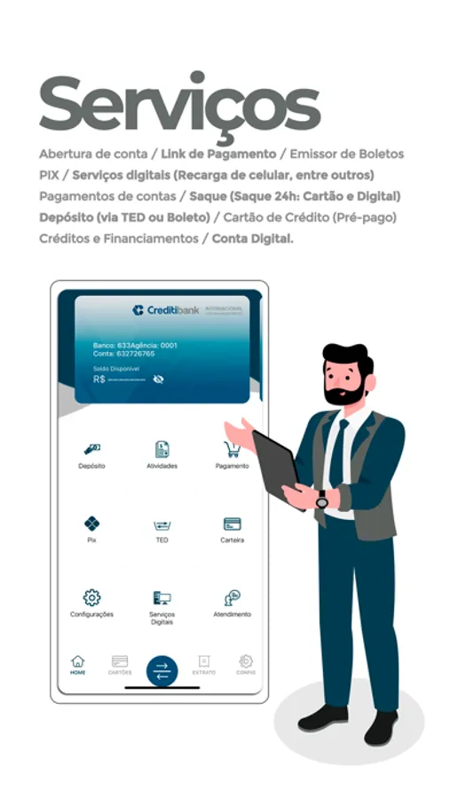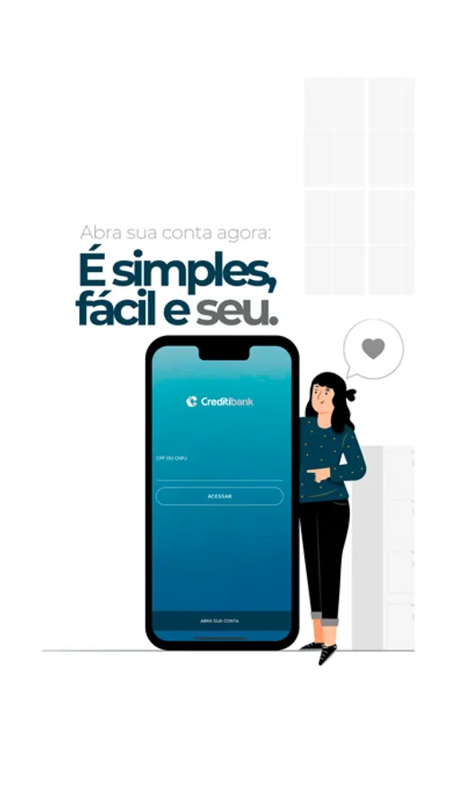 "Abra sua conta digital no CreditiBank. Evoluímos cada vez mais para que você tenha a melhor experiência, O CreditiBank oferece uma conta corrente completa e totalmente gratuita!