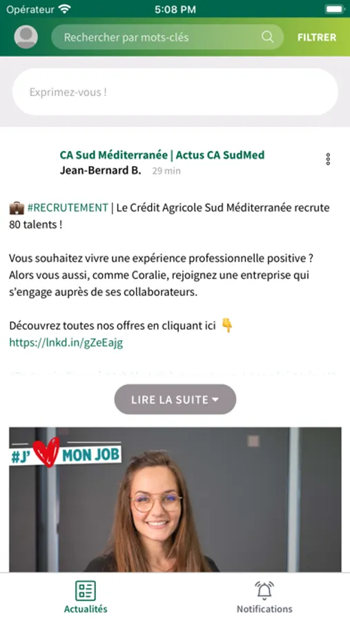 Grâce à l'application Tous engagés, suivez les actualités de l'entreprise, découvrez les offres de recrutement du moment et plus encore.