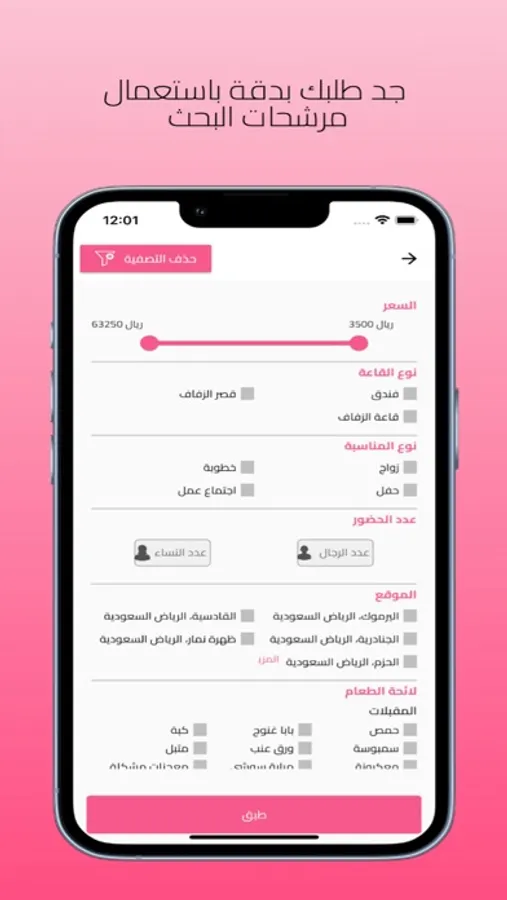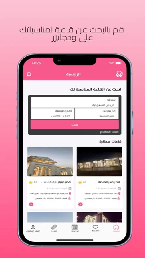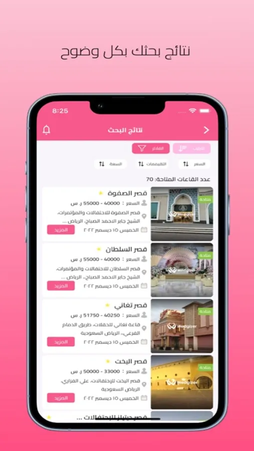 - البحث عن قاعة عن طريق المدينة، موعد المناسبة ، نوع القاعة، عدد الحضور والعديد من معايير البحث الاخرى.
