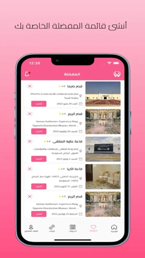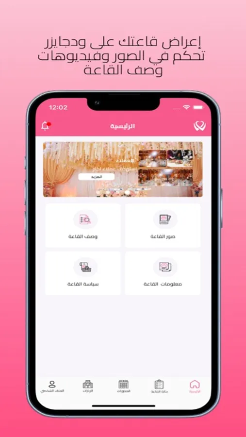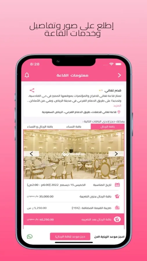 - الاطلاع على بيانات القاعات المحدثة بشكل لحظي كحالة القاعة ، الخدمات، المرافق، بوفيه الطعام ، الصور والفيديوهات
