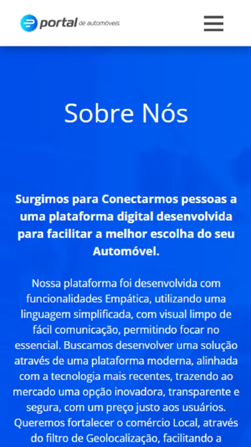 Nossa plataforma foi desenvolvida com funcionalidades Empática, utilizando uma linguagem simplificada, com visual limpo de fácil comunicação, permitindo focar no essencial. Buscamos desenvolver uma solução através de uma plataforma moderna, alinhada com a tecnologia mais recentes, trazendo ao mercado uma opção inovadora, transparente e segura, com um preço justo aos usuários. Queremos fortalecer o comércio Local, através do filtro de Geolocalização, facilitando a aproximação entre o vendedor e o comprador, permitindo selecionar o raio de distância de busca do automóvel que procura. Nosso foco é nos automóveis e não em comerciais e propagandas dentro da plataforma. Com isso transformamos uma concorrência entre os anunciantes mais igualitária, sem privilégios por portes de empresa. E não paramos por aqui, estamos aceitando sugestões e dicas para seguirmos desenvolvendo melhorias na nossa plataforma, buscando trazer as melhores soluções de funcionalidades, produtos e serviços para usuários de automóveis e empresas do segmentos automotivo.