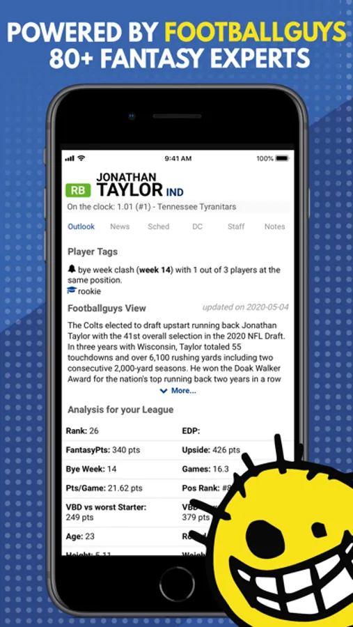 • Full integration with Footballguys Rate My Team: finish a mock (or draft) and get instant feedback to how well you did