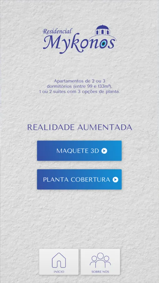 O aplicativo do Residencial Mykonos RA conta com visões do projeto 3D em realidade aumentada, explore sua fachada e a fabulosa cobertura com piscina, sala de jogos e salão de festas.