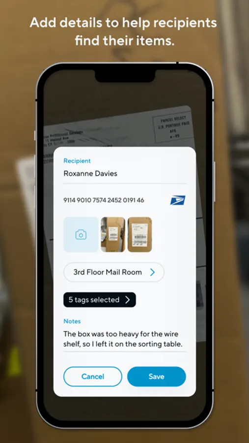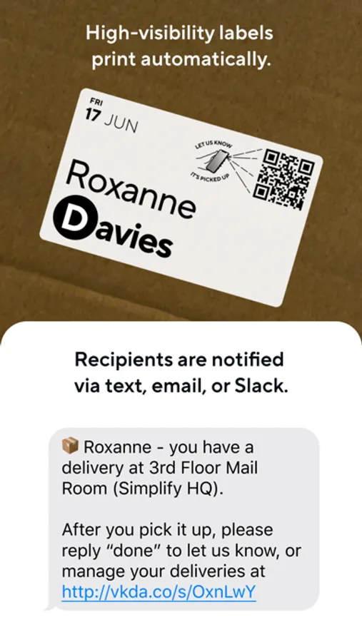Streamline your mailroom with a simple app to scan packages, notify recipients and manage deliveries.