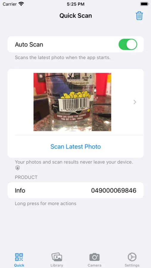 Better yet, you can simply turn on "Auto Scan" and the app will scan the most recent photo automatically every time it starts.