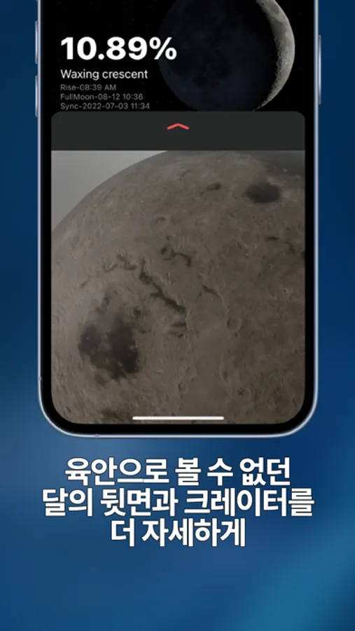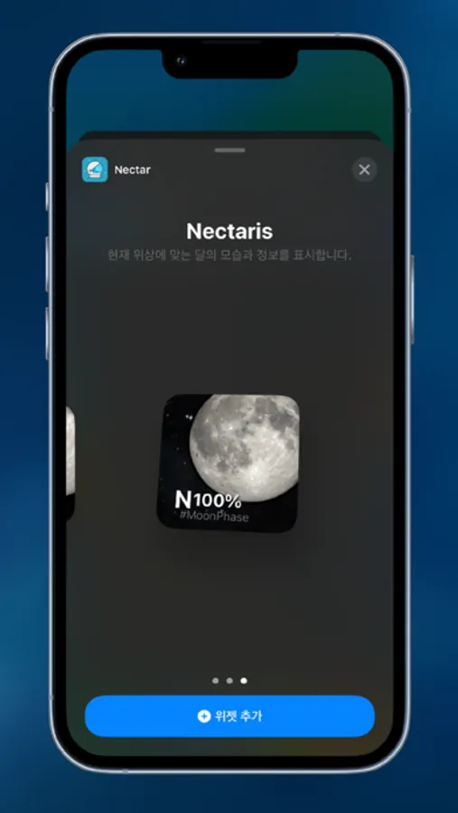 달의 위상을 표현하는 위젯과 달의 밝기, 다음 보름달 등 다양한 정보를 제공합니다.