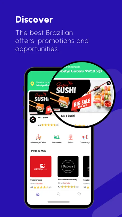 Stay tuned for promotions, coupons, and recommendations of the best Brazilian services. Tap the heart button to discover and explore the best opportunities nearby.