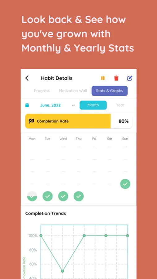 3. Statistics for each habit: Trends, Completion Rates, and Yearly Progress View.