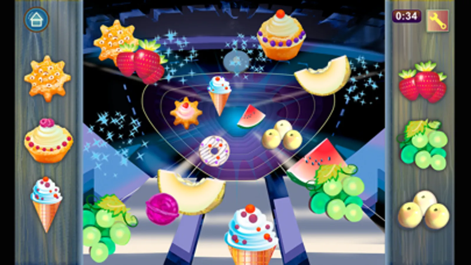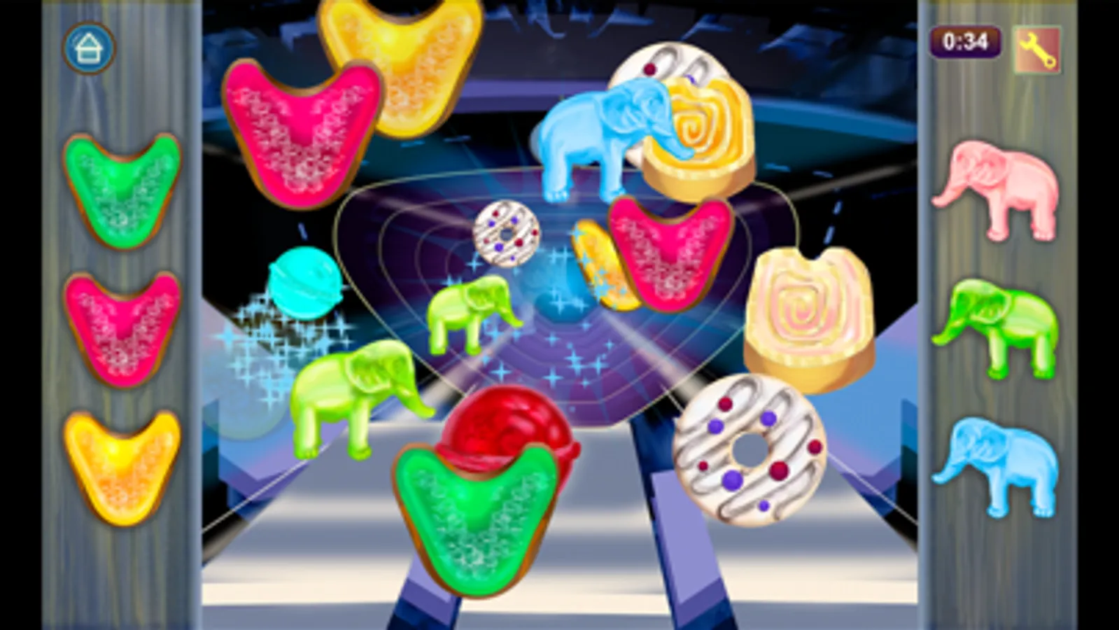 Catch the sweets by tapping the side buttons to match both the shape and color. Act as fast as possible, relying on your dexterity and concentration.