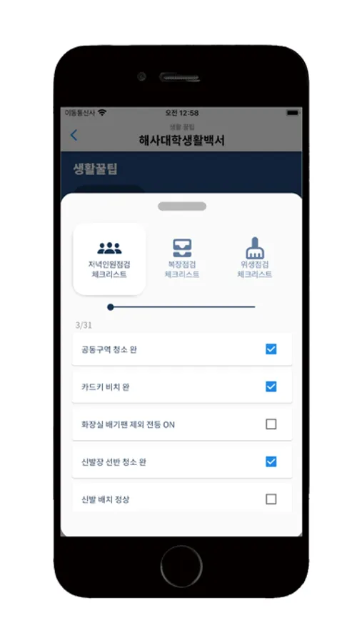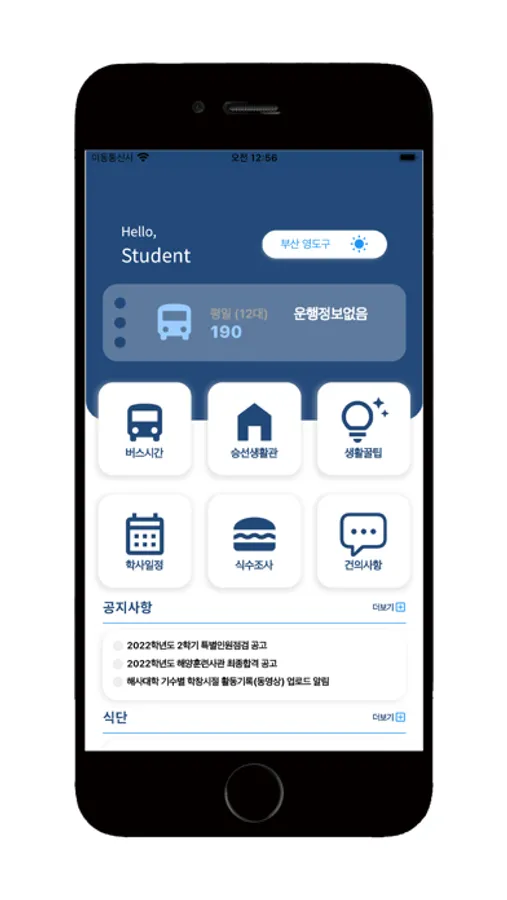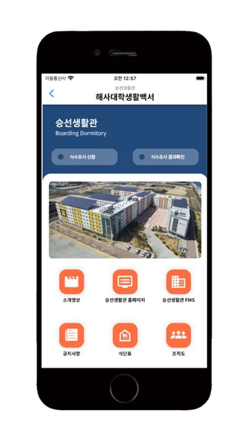 - 승선생활관 공지사항, 식단표, 시설소개, 조직도