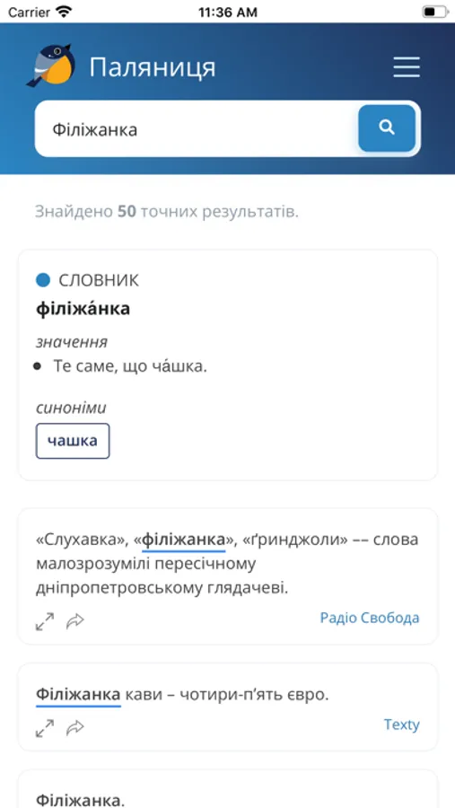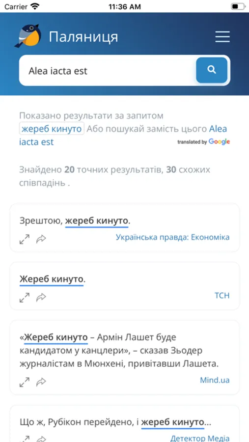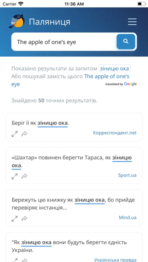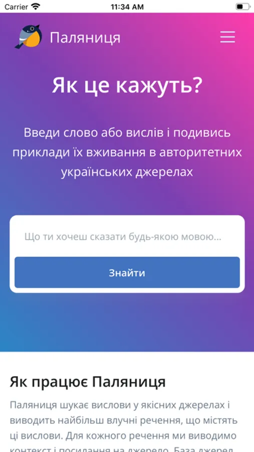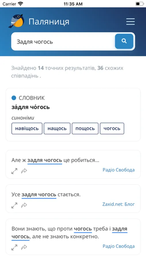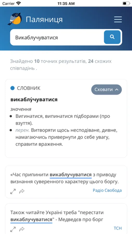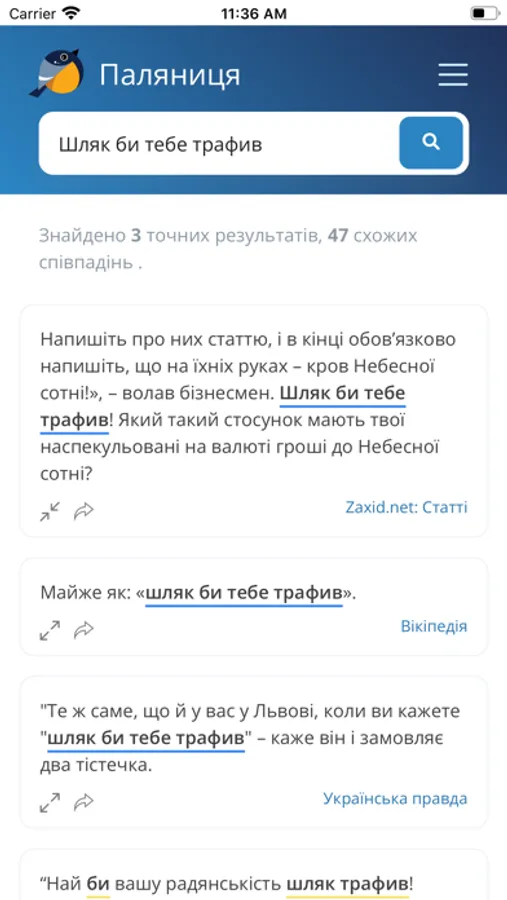 Сервіс знаходить слова і вислови виключно у авторитетних джерелах. На таких джерелах є якісна перевірка текстів та редакційна політика. Тож використання вислову на декількох джерелах свідчить, що так дійсно кажуть.