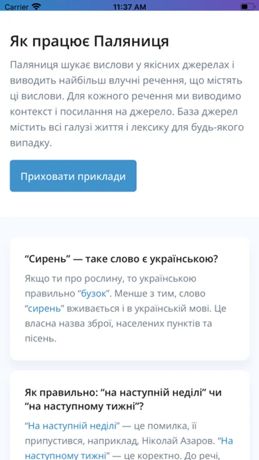 Для кожного вислову ми подаємо контекст — речення до і після. Це дає змогу зрозуміти, про що йде мова, емоційний окрас тексту, тип лексики. Щоб зрозуміти контекст повністю, можна перейти на джерело за посиланням і переглянути всю статтю. Для словникових слів та деяких зворотів ми виводимо тлумачення.