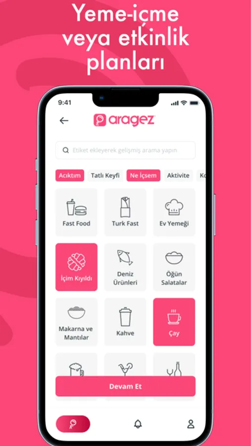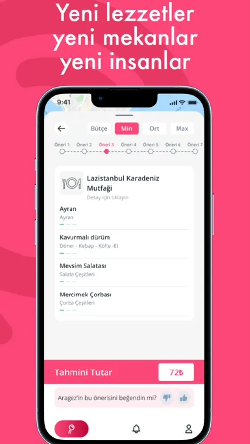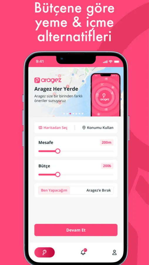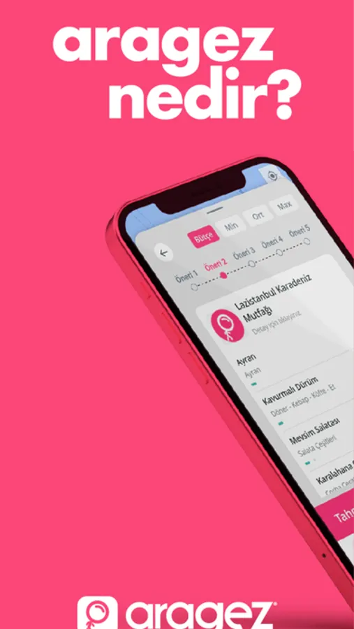 • Aragez belirlediğin bütçeye ve kriterlere göre yeme-içme alternatifleri üretir.