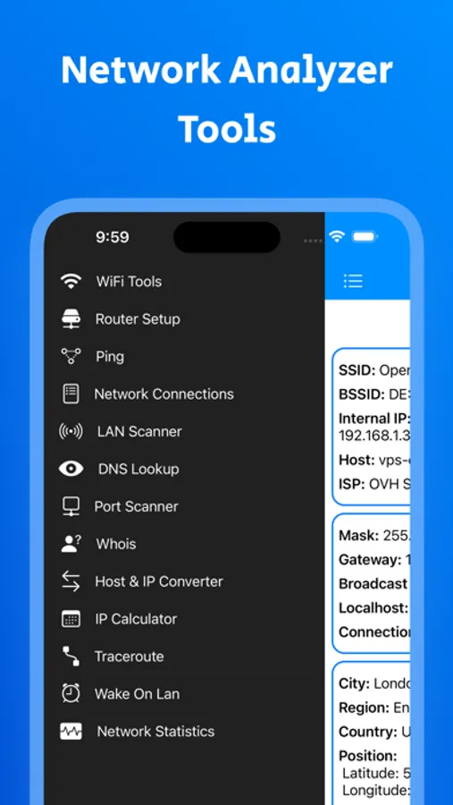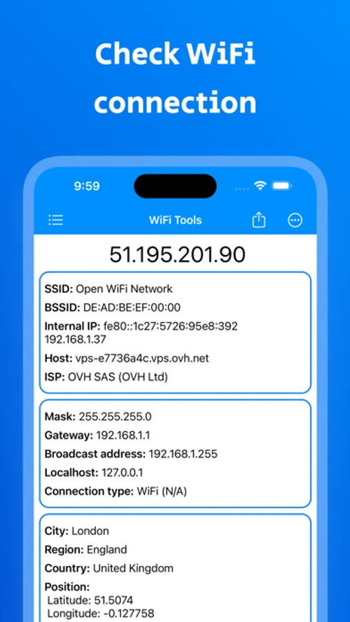 WiFi Tools is a set of network utilities that helps users all over the world to understand: Who is connected to their wifi, scan home and corporate networks, check whether their network has been hacked or not, is it safe? Using the full power of wifi technology, you can check if there are hidden cameras and if your ISP provides the speed you pay for, detect your dns server. App find, ping and identifies all devices connected to your network, analyzes download speed as well as connection delays, displaying detailed network information in real time on the screen of your mobile device. Also you can use app with proxy connection or work with vpn enabled.