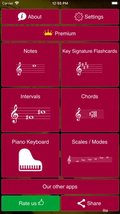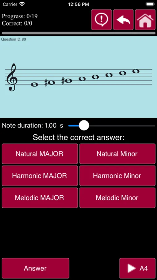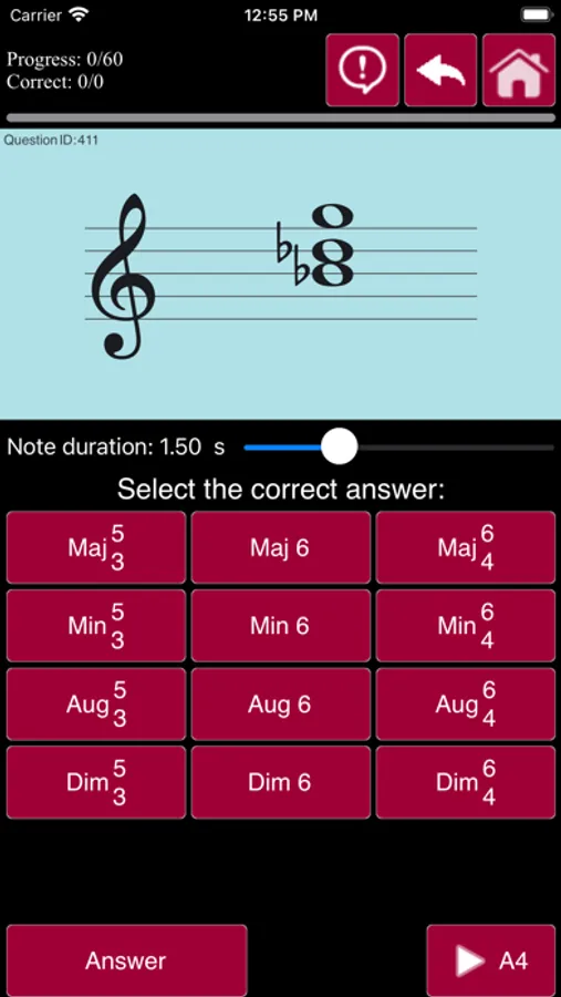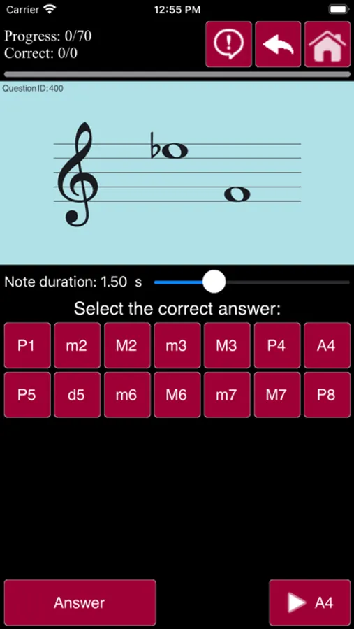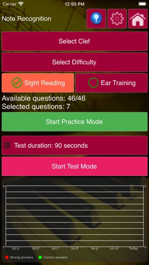 For each section, you have the option to filter the questions to suit your needs and skill level, and you can choose to train your hearing or your score reading skills. In Test Mode, you'll be presented with a predefined number of questions in random order, with an emphasis on the questions you answered correctly the least. Your progress is recorded in the charts for easy tracking. In Practice Mode, all questions are presented in random order, and when you reach the last question, the cycle starts over automatically. This mode is great for more casual practice without the pressure of tracking your progress.