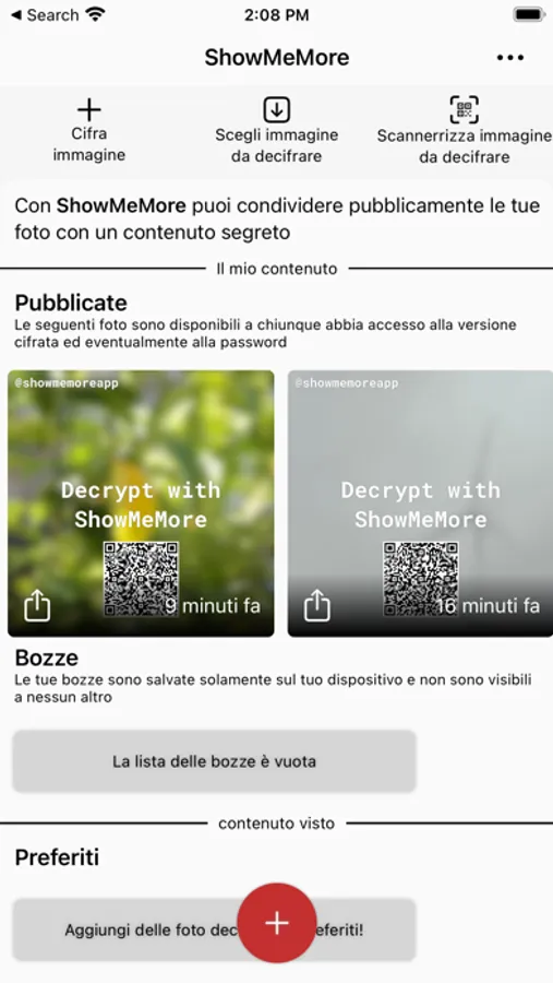 The app allows you to encrypt an image with a secret content. The encryption obscures the image providing a unique QR code and to open it you need to use the app.