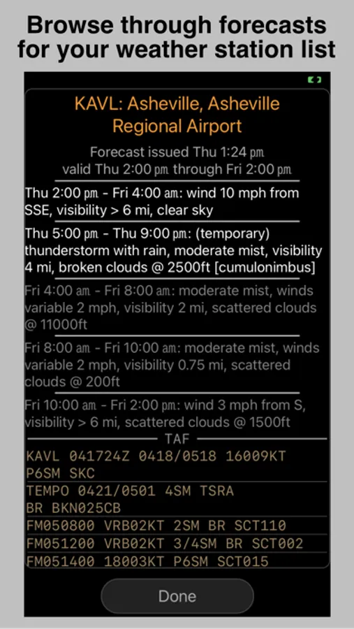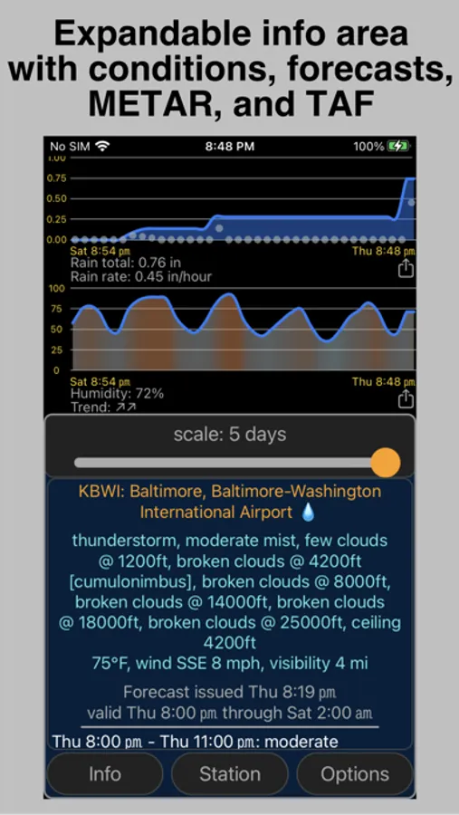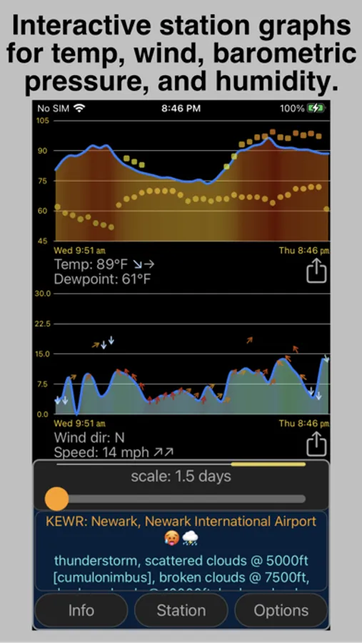 WeatheryWhere uses NOAA's National Weather Service's data service to display interactive weather graphs and forecasts from thousands of international weather stations. In addition to displaying hourly weather data and trends over the last five days, the app also displays forecast and current condition data using the international METAR and TAF weather reporting standards used for aviation. You can search for a weather station near you using the app's interactive station map, or you can use the app's auto-find feature to automatically find the weather station nearest you. WeatheryWhere includes support for notifications to alert you of weather condition changes and events at your selected weather station - for example, wind above a selected speed, or thunderstorms in a station's vicinity.