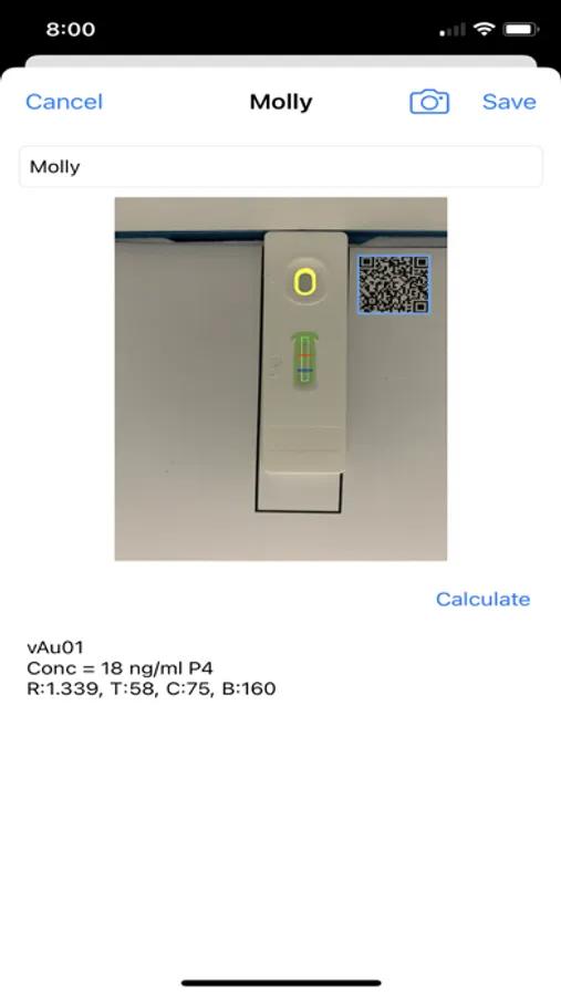 The “K9 P4” app does image analysis of the Test and Control lines of a Lateral Flow cassette photo , The “K9 P4 ” app calculates the progesterone concentration of the sample by interpolation of the sample on an internal standard curve.