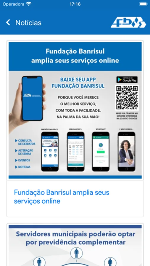 A Fundação Banrisul ficou ainda mais próxima de você. O Aplicativo FB é mais um canal para participantes e assistidos, obterem informações e serviços de forma rápida e intuitiva de onde você estiver.