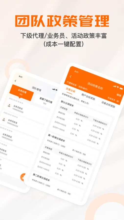 团队政策管理:下级代理/业务员、活动政策丰富(成本一键配置);