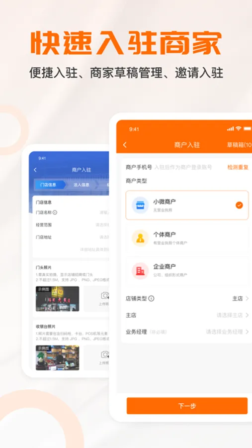 快速入驻商家:便捷入驻、商家草稿管理、邀请入驻;