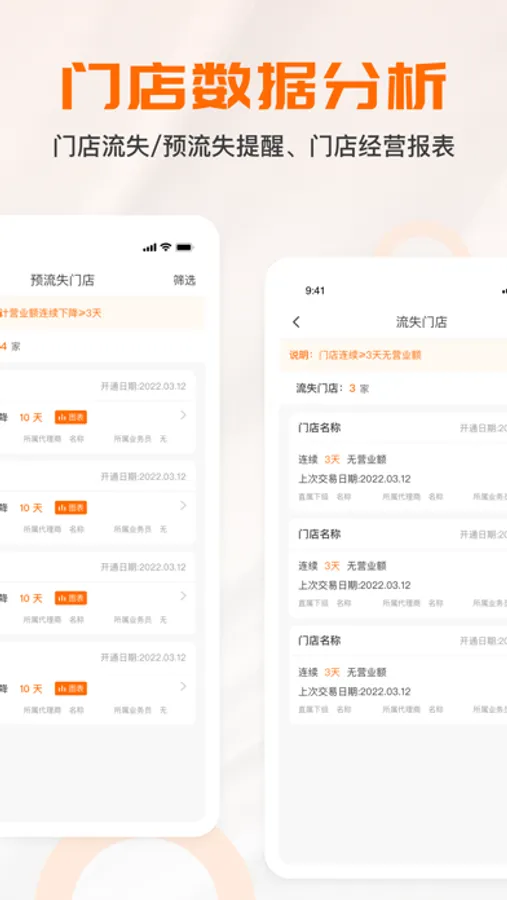 门店数据分析:门店流失/预流失提醒、门店经营报表;
