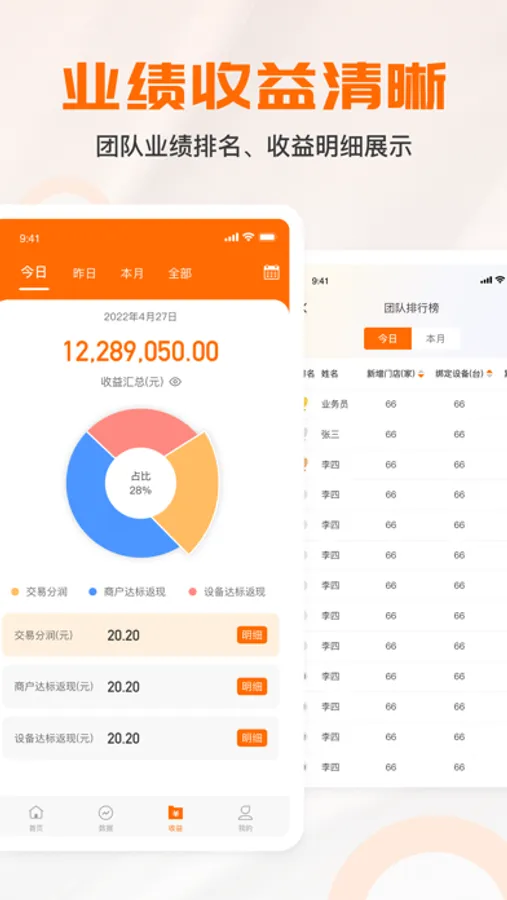 业绩收益清晰:团队业绩排名、收益明细展示;