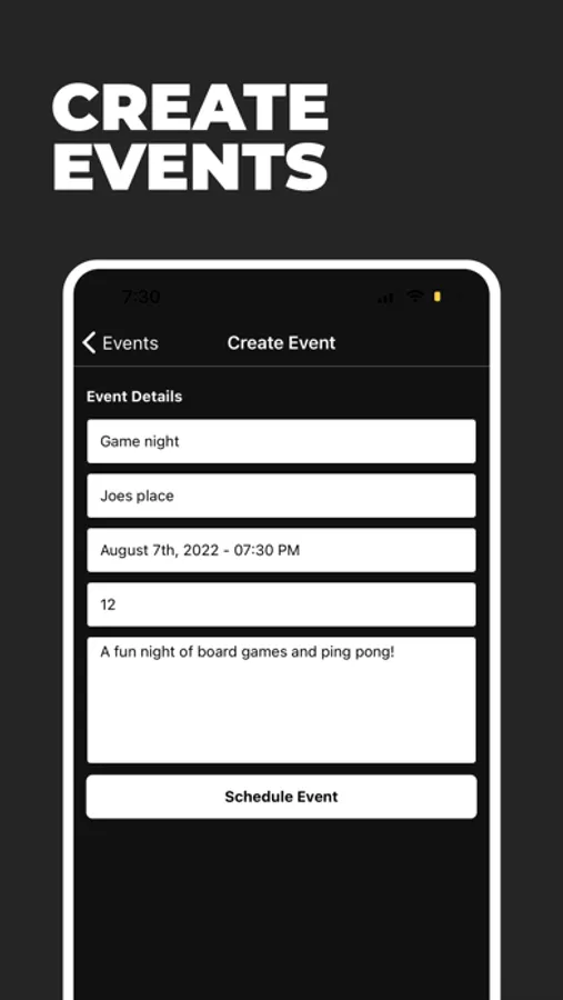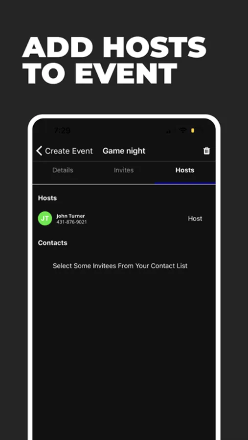 Send invites to contacts saved on your phone, each invitee will receive an autogenerated SMS with the details of your event, and 2 three-digit codes to respond with. One indicating they will be attending your event, and one indicating that they will not be.