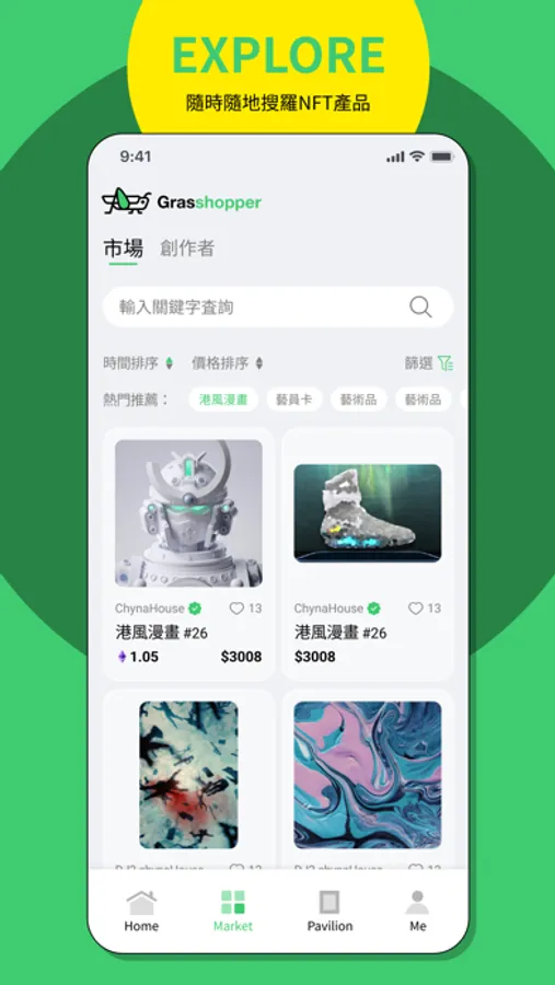 Grasshopper為《都市日報》同屬機構「都市傳訊集團」旗下的NFT交易平台,可使用加密貨幣之餘,亦同時支援法定貨幣及信用卡結算作買賣交易。此外,Grasshopper亦提供NFT由鑄造至管理的垂直服務方案,操作介面簡單,讓用家輕鬆買賣NFT。