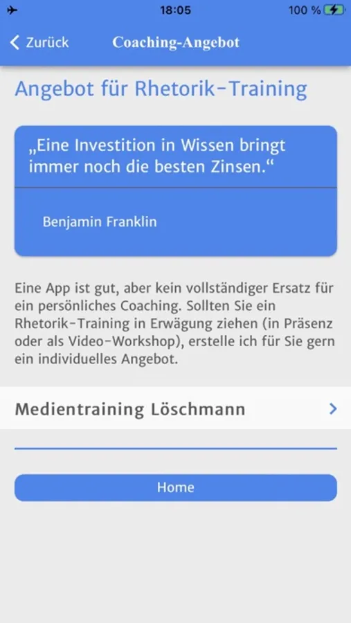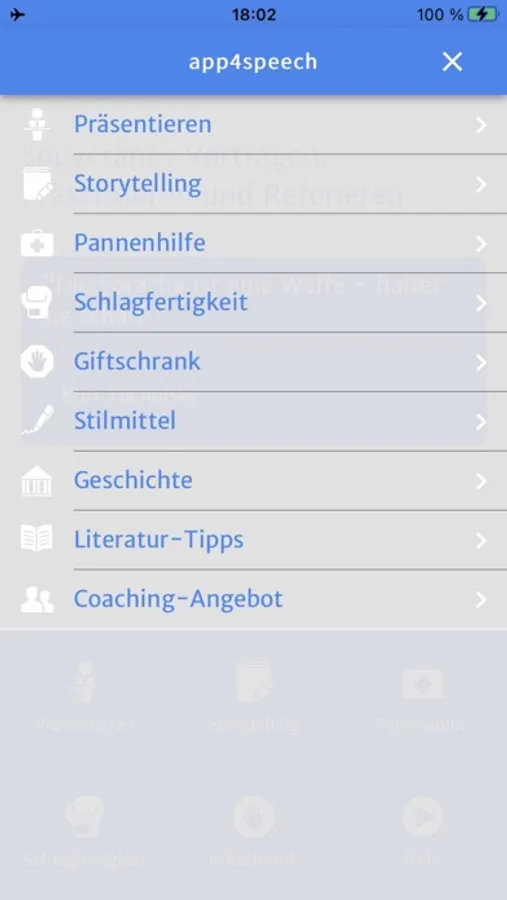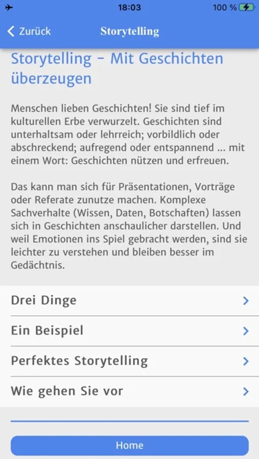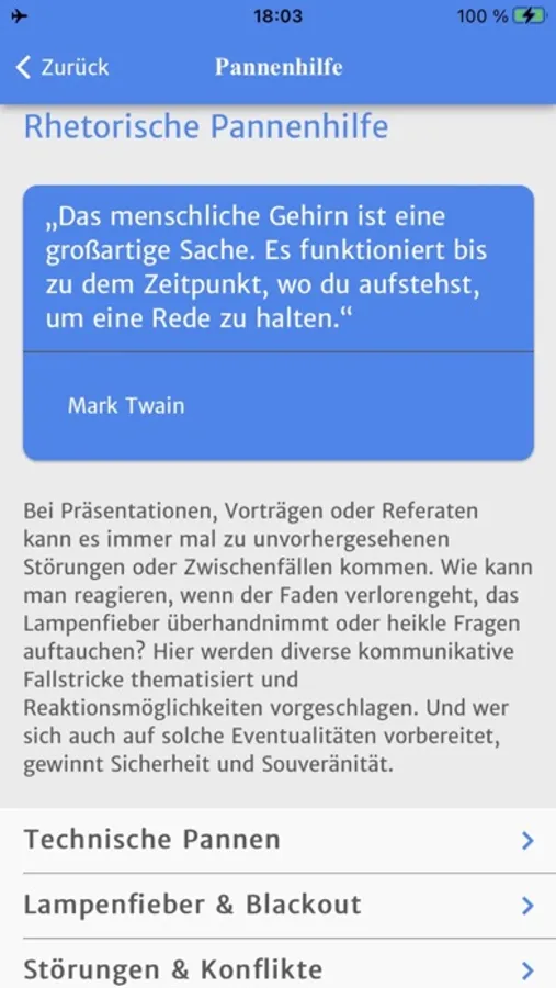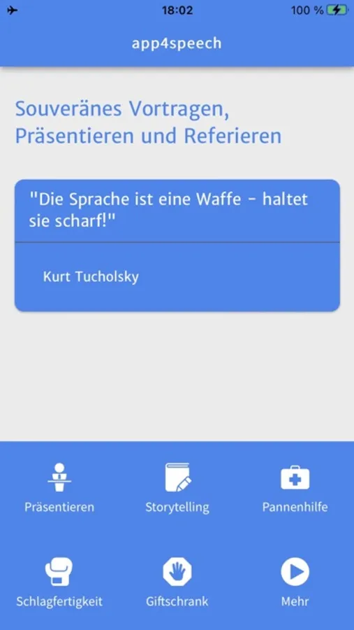 Diese App ermöglicht Ihnen einen schnellen und vollständigen Zugriff auf alle Bereiche der Rhetorik. Sie zeigt Ihnen Tipps und Tricks, wie Sie Präsentationen, Vorträge oder Referate besser vorbereiten können und damit Sicherheit gewinnen. Sie bietet Hilfestellung bei rhetorischen Pannen und erklärt, wie Sie kritische Situationen souverän meistern können. Die App vermittelt außerdem Techniken, mit denen Sie Ihre Schlagfertigkeit trainieren und wie Sie durch „Storytelling“ mit Geschichten überzeugen können.