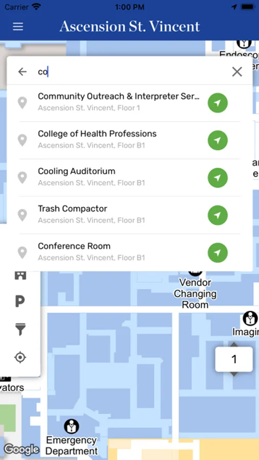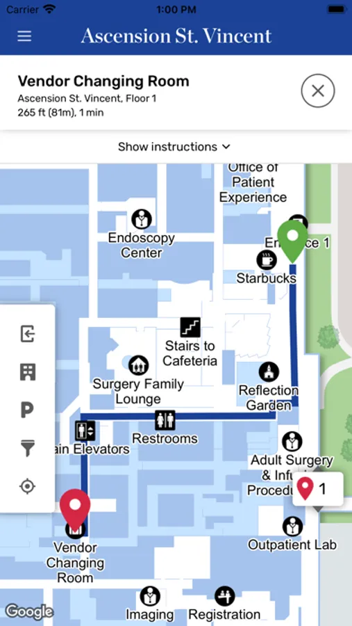 • Locate additional on-site amenities: cafeteria, gift shop, restrooms, chapel and more.