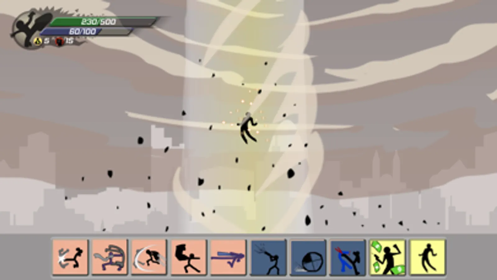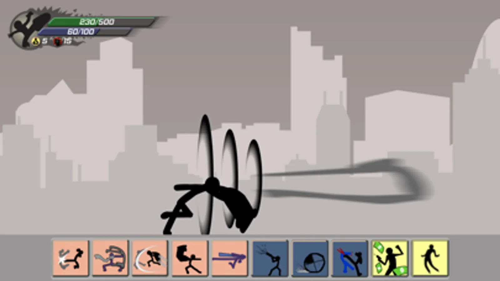 Attack: normal attack, punch and hit other stickman, deal damage. consume patience. and gain stress.