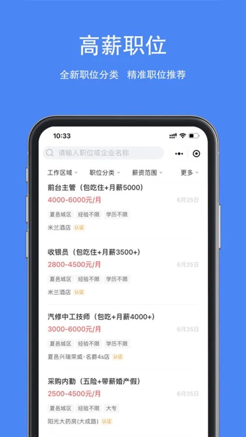 夏邑人才网-让求职招聘更简单! 【职位更匹配】智能准确匹配,机会更大、更多 【职位更真实】企业/职位均人工南核,6重严审保障职位真实有效 【求职更高效】与HR在线畅聊,在家也能换工作 【职位更高薪】心有多大,薪有多高,好工作,月入过万不是事儿 【附近好工作】锁定夏邑附近好工作,上班绝不迟到 【企业更全面】行业各业,2万家企业,10万+好工作任你挑 【简历更有型】针对不同专业/行业设定上万种模板,让你求职更通畅