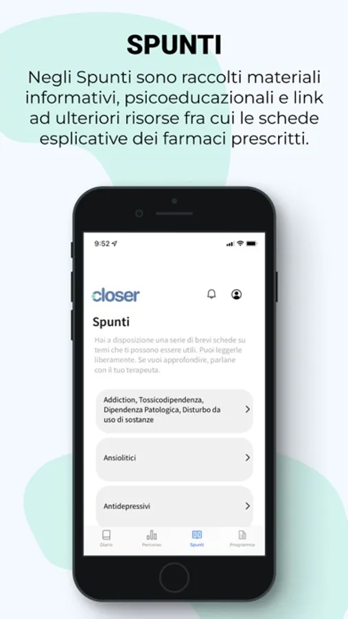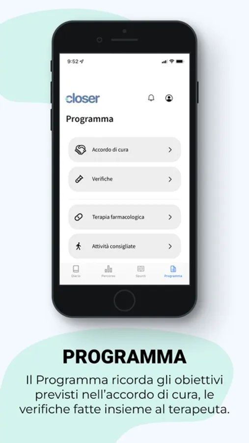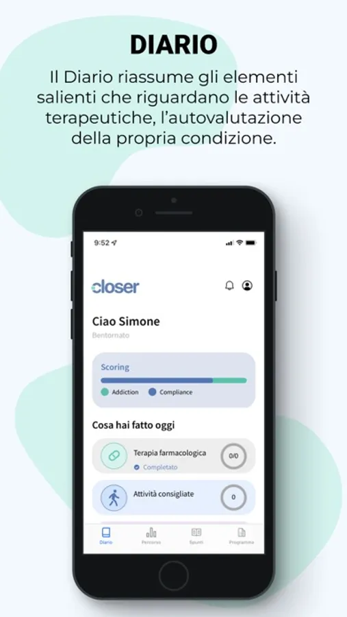 CLOSER non è quindi una APP pensata per un utilizzo “solitario” da parte del paziente o per l’autoaiuto ma una APP che tiene più vicini paziente e terapeuta sostenendo costantemente la motivazione al progetto di cambiamento intrapreso.