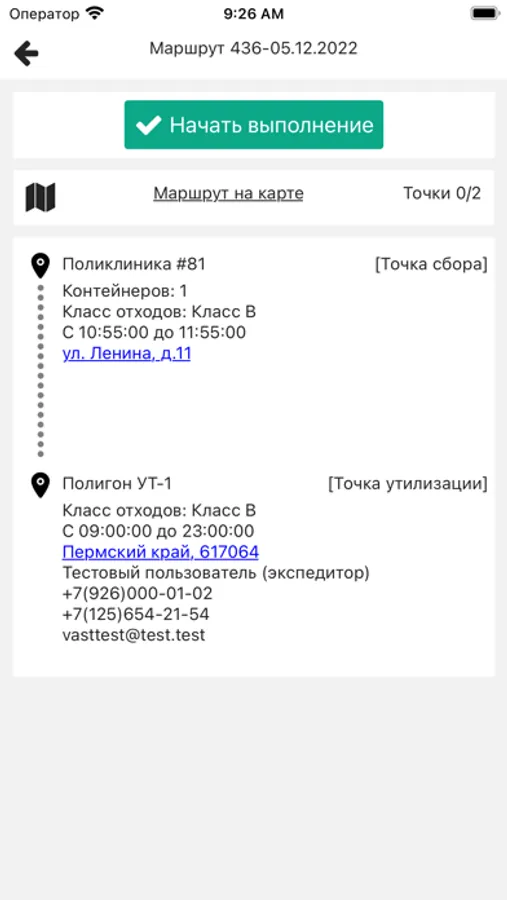 2. Отображение детальной информации о маршруте: списка точек сбора и утилизации отходов,
