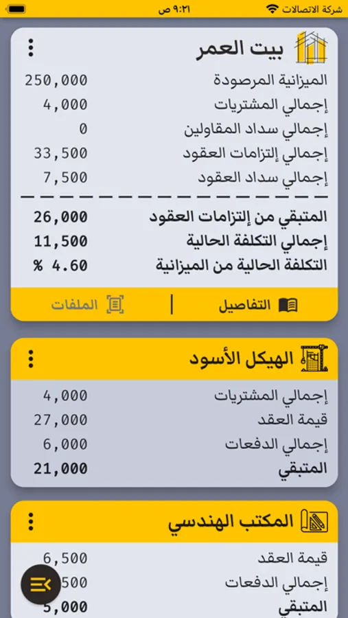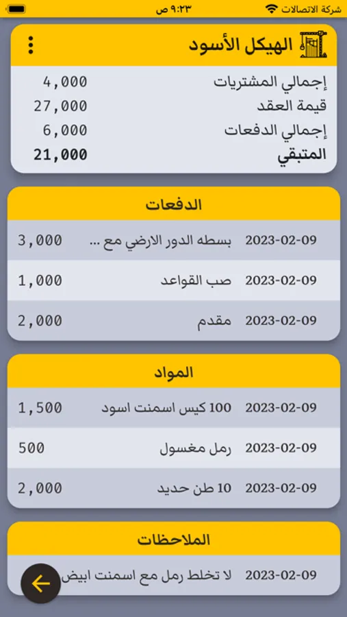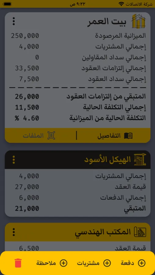 - إضافة دفعات، مشتريات، ملاحظات، لكل عقد أو بند مع إمكانية إرفاق صور وصولات الاستلام والسداد، صور الفواتير، وصور من موقع البناء للملاحظات